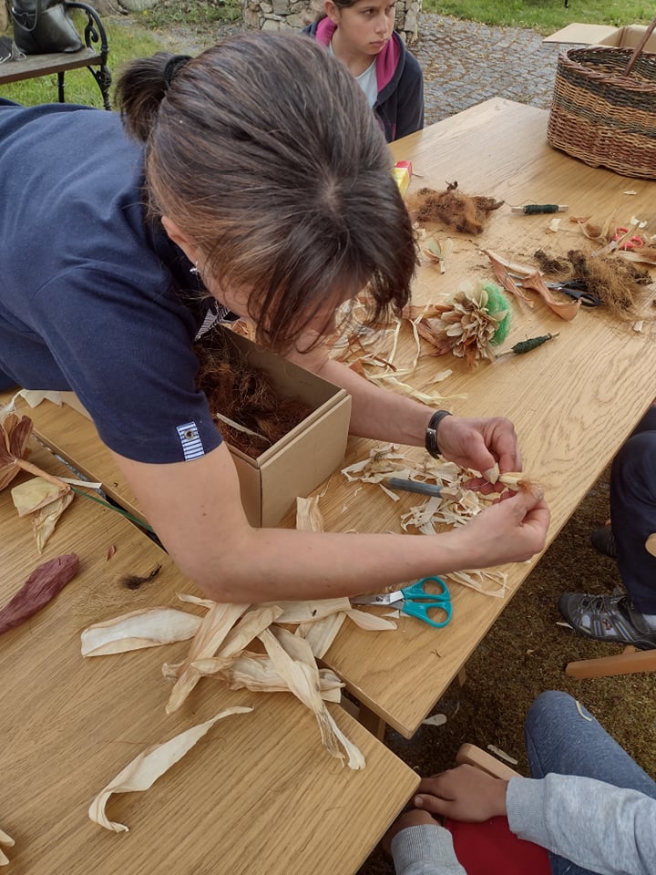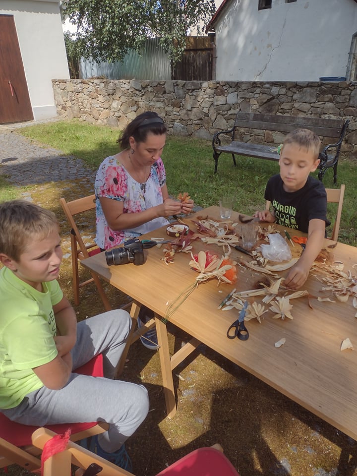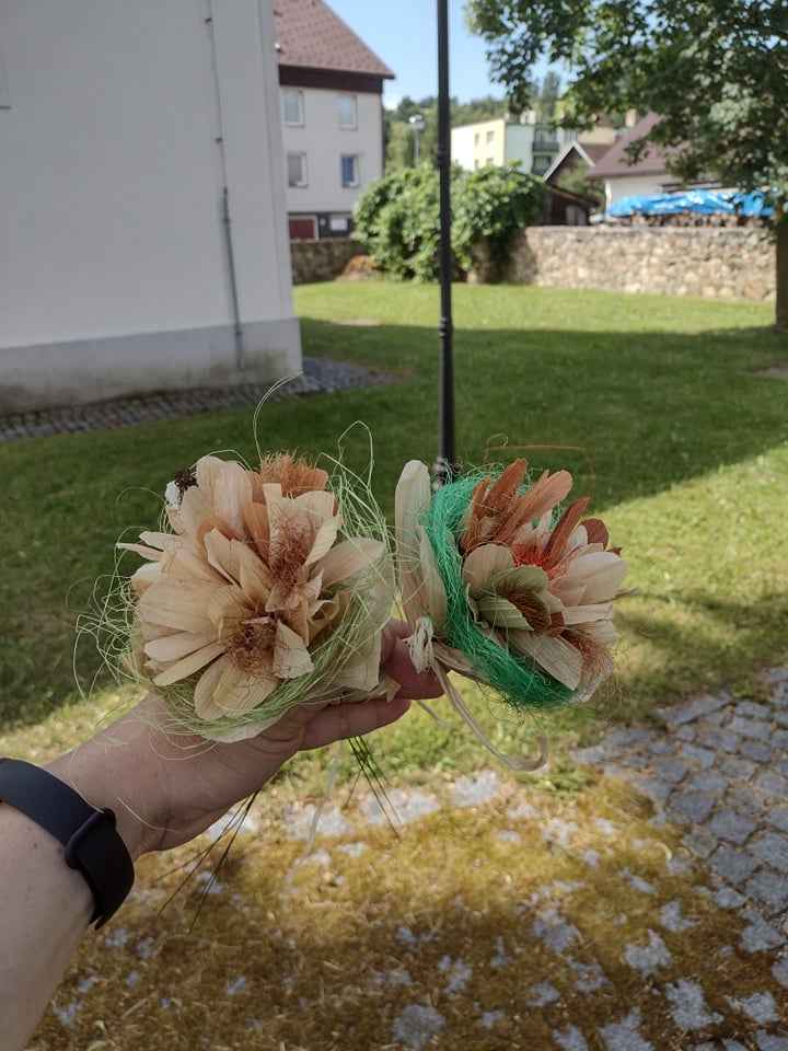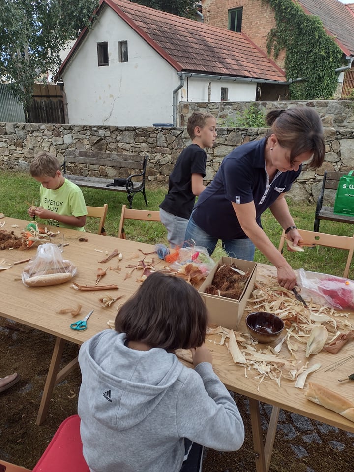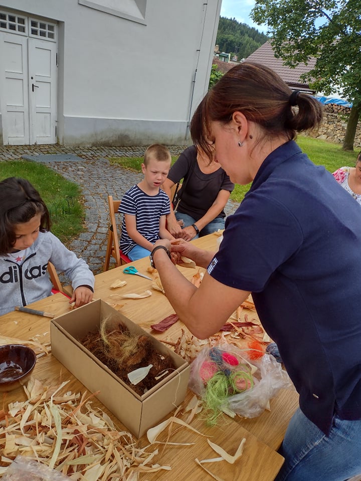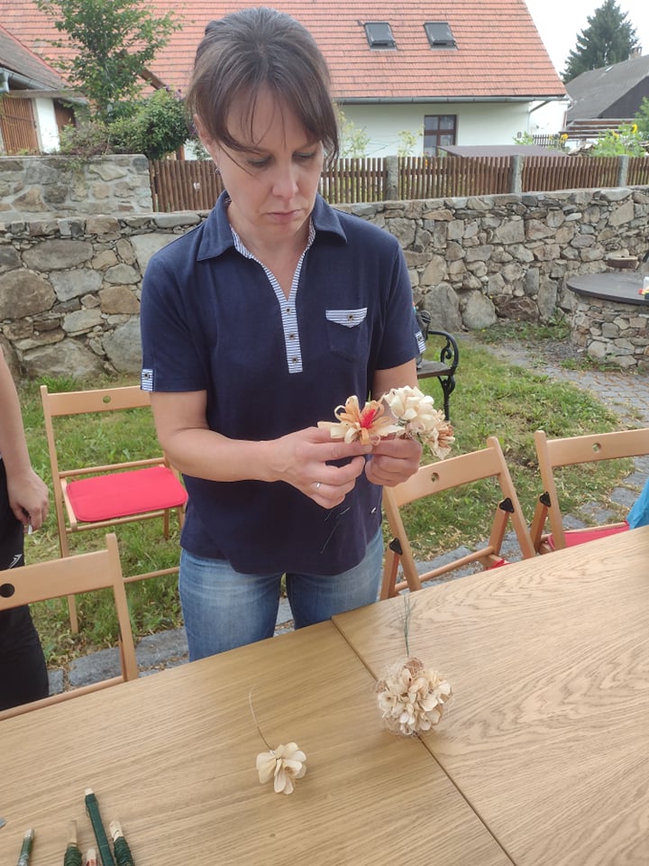 Odborník nejprve povídal o své škole, o své práci v zahradnictví. Poté dětem vysvětlil, kdy sbírat šustí, jak musí vypadat a jak nesmí, jak se má skladovat, jak se může barvit. Všichni čestně slíbili, že po sklizni kukuřice, půjdou sbírat pro odborníka kukuřičné šustí na další tvoření – figurky. Odborník nám předvedl, jak si z kukuřičného šustí vystříhat jednotlivé lísty, jak je správně smotat dohromady a vše pěkně ukončit drátkem. Nesmíme zapomenout také na „vlásky“ z kukuřice jako pestíky kytičky. Z několika malých kytiček si každý vytvořil „puget“ pro svoji maminku.